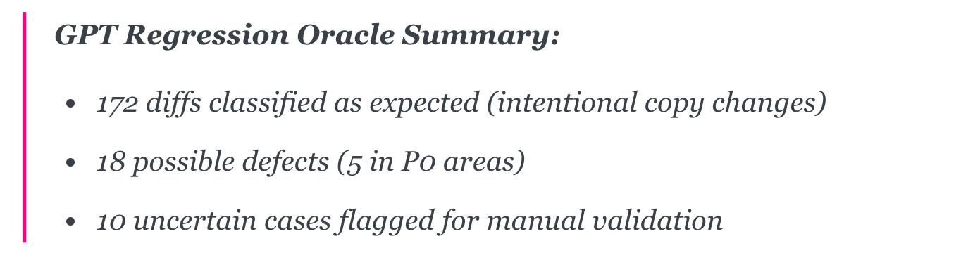 Instead of engineers reviewing screenshots or JSON dumps, GPT pre-filters the noise. Review time per regression can drop from hours to minutes. - Reduced False Positives